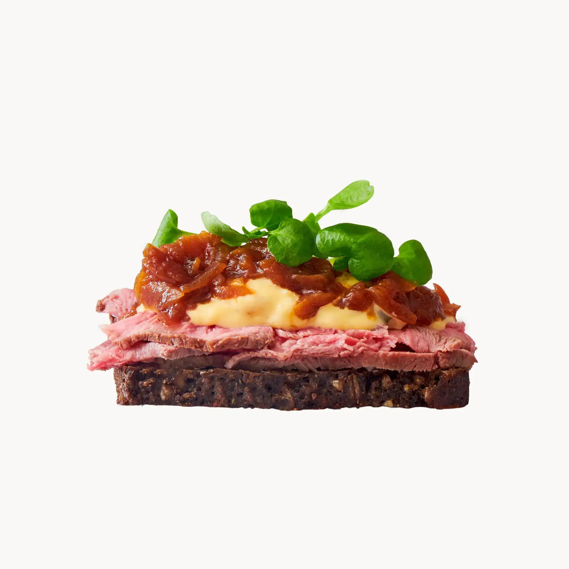 Roastbeef med remoulade, bløde løg, tallerkensmækker og ærteskud.